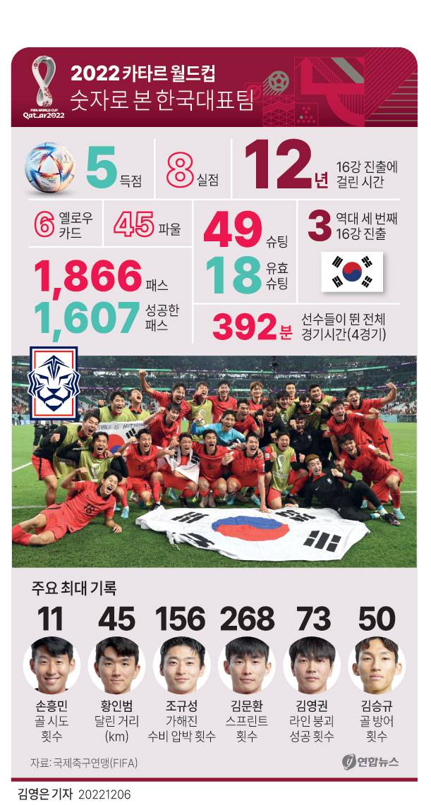 파울루 벤투 감독이 이끄는 한국 축구 대표팀은 6일(한국시간) 카타르 도하의 974 스타디움에서 열린 브라질과 2022 카타르 월드컵 16강전에서 1-4로 완패했다. 사상 처음으로 원정 월드컵 8강 진출에 도전한 태극전사들은 2010년 남아프리카공화국 대회 이후 12년 만에 16강 무대를 밟았다는 것에 만족해야 했다. 고군분투했지만 세계 1위인 브라질을 넘긴 역부족이었다. 높은 벽을 넘지 못한 대표팀은 아쉬움을 삼켰다. 사흘 전 16강 진출을 확정하고 기쁨의 눈물을 쏟았던 손흥민도 웃지 못했다.