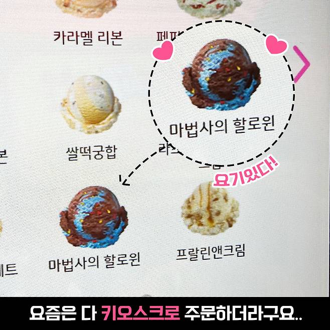요즘에는 메뉴판이 사라진 매장도 정말 많아요~메뉴판이 없어 키오스크로 가서 아이스크림을 고르는데, 종류가 너무 많아 헤메다가 찾았어요ㅋ.ㅋ