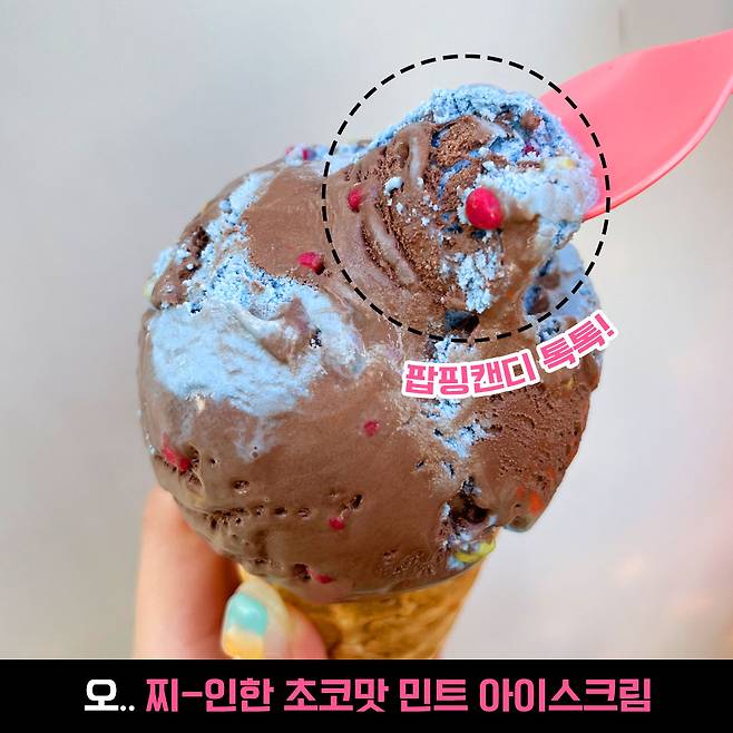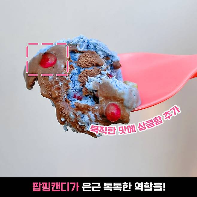 밥심은 민초를 좋아하긴 하지만, 요건 많이 먹으면 질리겠다 싶을 정도로 진해요. 그런데 팝핑캔디가 진한 아이스크림 맛에서 식감을 살려주는 역할을 톡톡하게 해요!