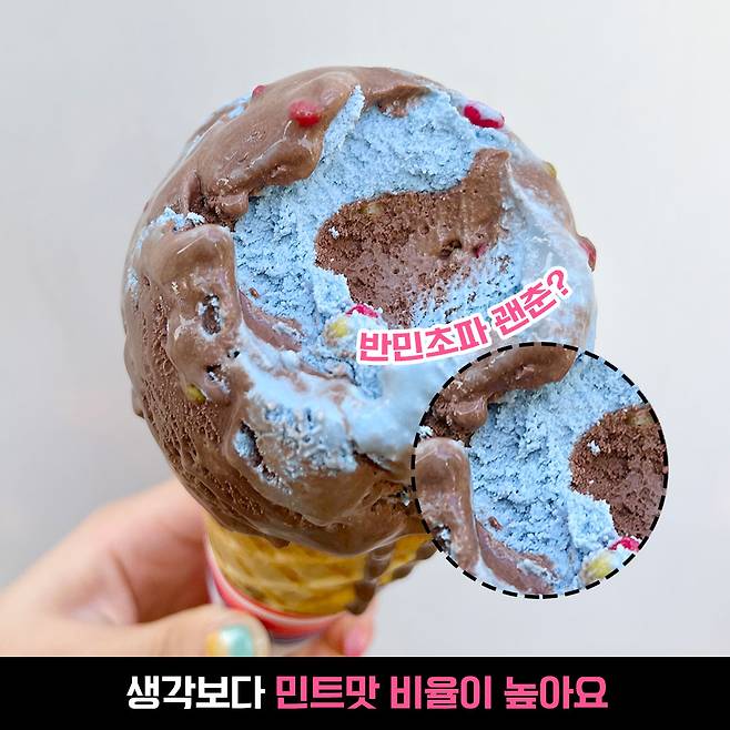 한 스푼 뜨고 안쪽을 봤는데 생각보다 민트맛 아이스크림의 비율이 높더라구요. 대부분 초코와 민초를 같이 먹긴 했지만, 어떤 부분은 민초만 먹어지는 곳도 있었어요.