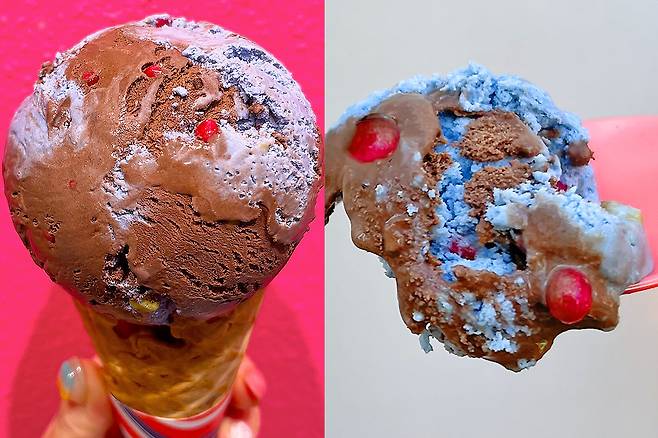 비주얼이 독특하죠? 저 파랑색은 바로 민트초코맛이고, 갈색은 익숙한 초콜릿 맛이에요. 그리고 입에서 와다다다 소리가 나는 팝핑 캔디가 콕콕 들어가 있어요.