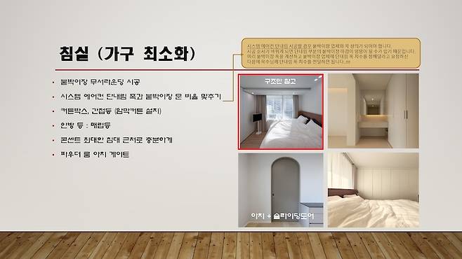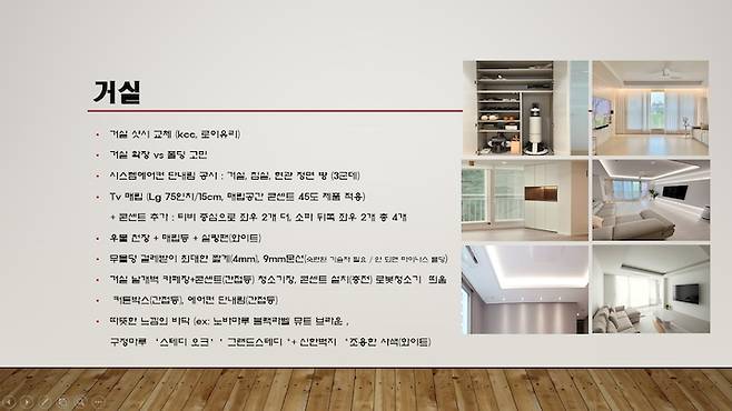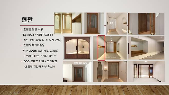참고로 말씀드리자면 인테리어를 할 때 턴키 업체에 맡기면 알아서 잘 해주겠지라는 생각은 놉! 저흰 어찌 보면 귀찮고 스트레스 받을 수 있는 부분이지만 조명 배치부터 중문 모양, 필름 색, 콘센트 위치까지 공간마다 일일이 원하는 부분들을 PPT로 레퍼런스를 작성해서 턴키 업체 미팅할 때 보여드렸어요.