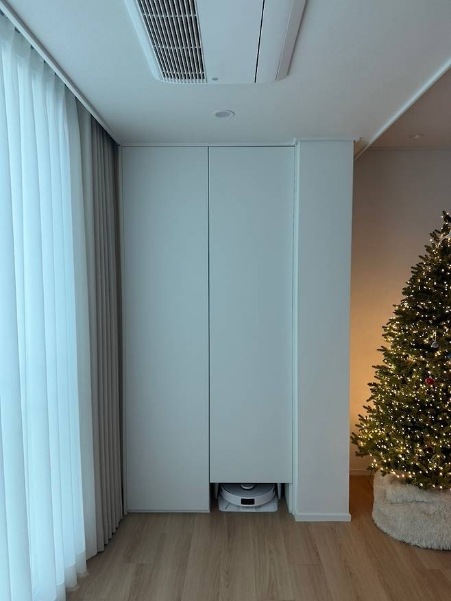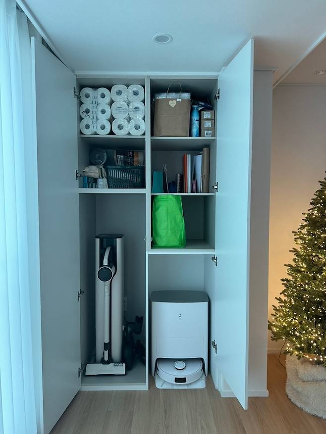 날개벽 길이만큼 수납장을 짜 넣어 무선 청소기와 로봇청소기 수납장, 그리고 잡동사니들을 넣어놓는 팬트리 공간으로 활용하고 있어서 만족하고 있답니다. 구축의 특성상 팬트리 공간이 따로 없어 이렇게 수납공간을 만들어 두니 집에 있는 잡동사니들을 깔끔하게 가릴 수 있고 정리 정돈되어 추천하는 부분이랍니다.