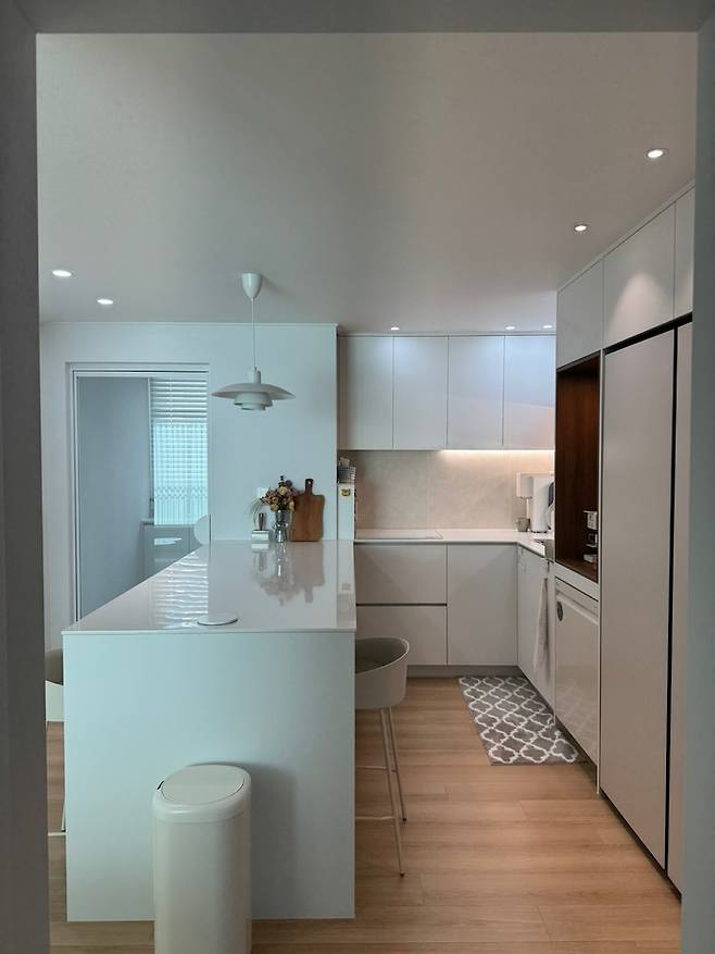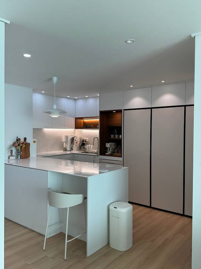 주방의 경우 요리하고 싶은, 깔끔하고 넓은 공간으로 만들고 싶어서 화이트 톤으로 싱크대와 아일랜드 식탁까지 통일하였고, 다소 밋밋해 보일 수 있는 주방에 포인트를 주고 싶어 오픈장과 카페장은 우드로 진행하였답니다.