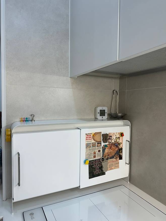 요리할 때 자주 쓰는 소스나 가루들은 수시로 써야 하기 때문에 잘 보이는 곳에 두는 게 좋잖아요. 그런데 그냥 밖에 두게 되면 지저분하고 보기 싫어서 수납장을 찾아보던 중 인덕션 옆 자투리 공간에 딱 맞는 크기의 수납장을 찾게 되었죠.