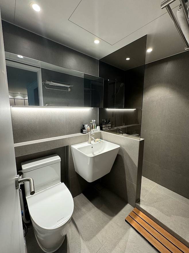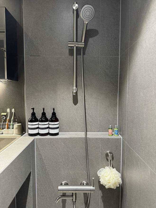 그리고 여기서 욕실 리모델링 할 때 한 가지 팁이라면 하프 조적벽 쪽, 샤워하는 공간만 습식으로 쓰기 위해 화장실 바닥에 단차를 만든 건 아주 잘한 부분이에요. 화장실 공간을 습식, 건식 부분으로 바닥 단차에 의해 나눠놓으니 건식 부분은 청소기로 관리하면 되어 화장실 관리 측면에서 편하고 좋답니다.