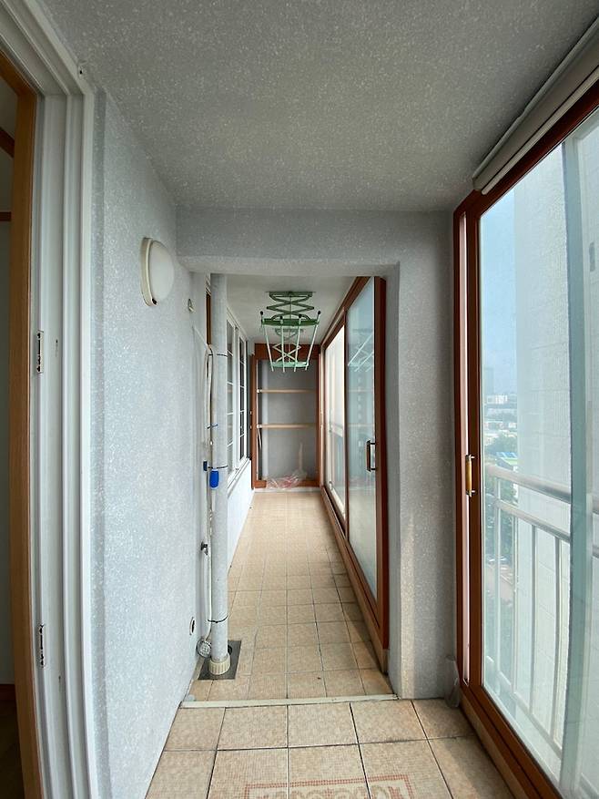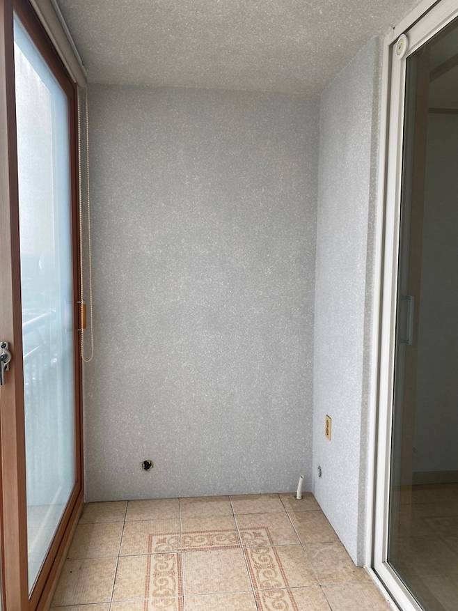 베란다 타일 사이에 거멓게 때 탄 줄눈 하며 체리색 촌스러운 샷시(새시) 틀까지 다 바꿨어요.