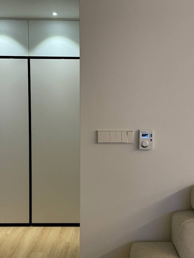 벽 까대기에 매립 박스 넣는 거까지 사실 스위치 시공 때문에 추가적인 비용도 꽤나 많이 들었고 그만큼 스트레스도 많았던 애물단지였지만 그래도 하고 나니 깔끔하게 시공돼서 만족하고 있답니다. 특히 스위치 키고 끌 때 터치감까지 좋아서 보는 재미, 누르는 재미가 나름 쏠쏠한 아이랍니다.