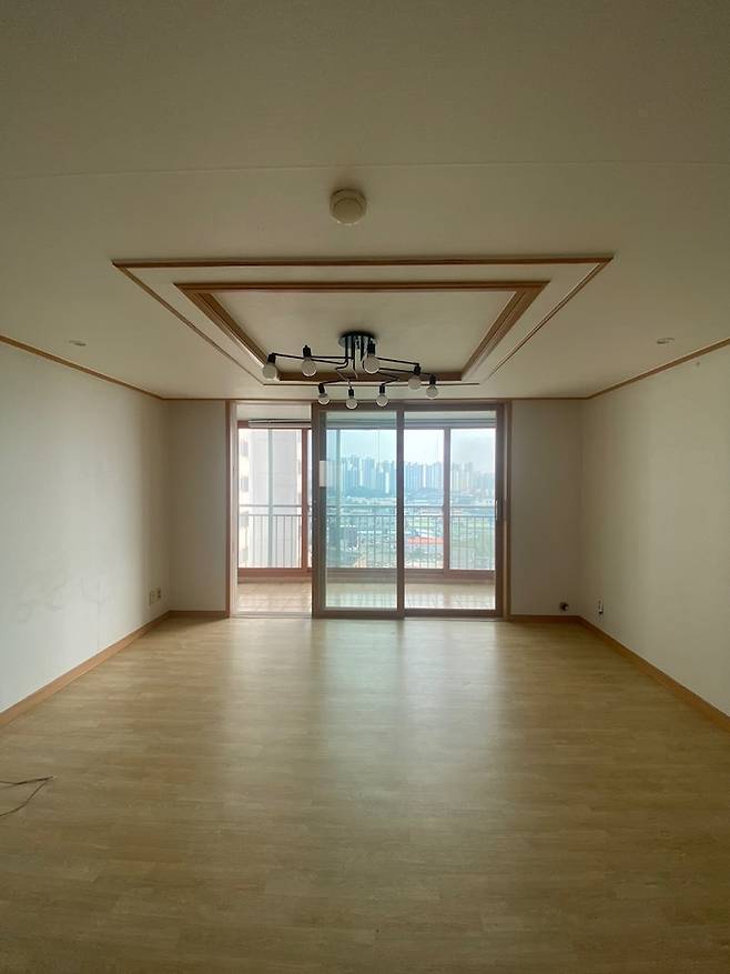구축 아파트다 보니 거실 또한 공포의 체리 몰딩, 그리고 답답해 보이는 걸레받이까지 그리고 저 거미 다리 같은 조명은 옛날에 유행했던 걸까요? 거실도 올 철거를 진행하면서 천장 평탄화 작업, 강마루, 벽지 교체, 시스템 에어컨 단내림 공사, 그리고 TV 완전 매립 박스, 마이너스 몰딩, 그리고 4mm 걸레받이, 필름 작업, 실링팬 작업까지 진행했답니다.