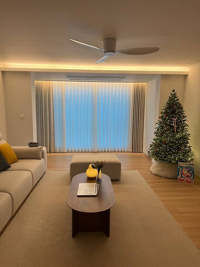 화이트 벽지에 우드 느낌 나는 강마루까지 저희가 원하던 화이트 & 우드의 따뜻하고 코지한 거실 AFTER 모습이랍니다. 그리고 특히 거실에서 제일 잘한 부분을 꼽으라면 바로 시스템 에어컨 설치에요. 참고로 저희 신혼집은 구축이다 보니 시스템 에어컨 설치 전에 단내림 공사는 필수 사항이었어요.