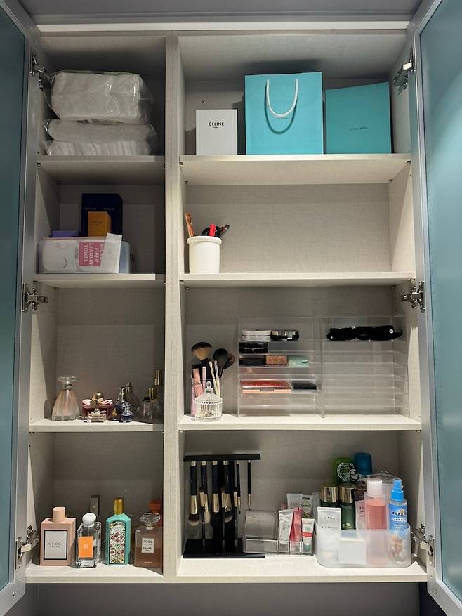 그래도 파우더룸에 화장도구, 화장품, 향수까지 다 정리할 수 있게 장을 짜 넣었더니 수납공간은 넉넉해서 좋더라고요. 그런데 이제 나이가 들어서 그런가 점점 색조 화장과 거리 두기를 하게 되고 화장품에 대한 욕심도 사라지더라고요? ㅎㅎ