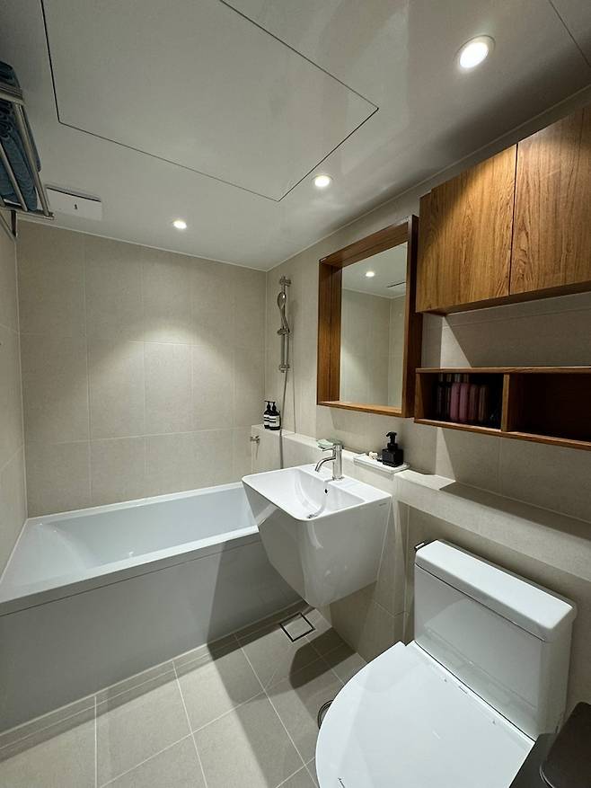저희 신혼집은 특이하게 침실 화장실이 거실 화장실보다 공간이 더 넓게 빠졌더라고요. 그래서 저나 남편이나 욕조파가 아니라서 욕조를 두지 않으려고 했으나, 친정어머니께서 나중에 아기가 태어나도 꼭 욕조는 필요하다는 말씀에 거실 화장실이 아닌 침실 화장실에 욕조를 시공했답니다.