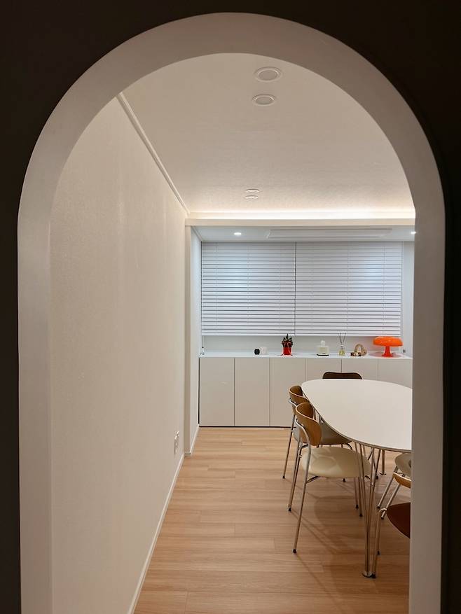 좁고 답답했던 입구 방이 확장과 아치 게이트시공으로 탈바꿈된 모습! 확장으로 인해 공간도 넓어지고 과감하게 문을 떼 버리고 아치로 게이트를 만들어 개방감까지 주니 이전과 달리 드라마틱 하게 변화된 공간이랍니다.