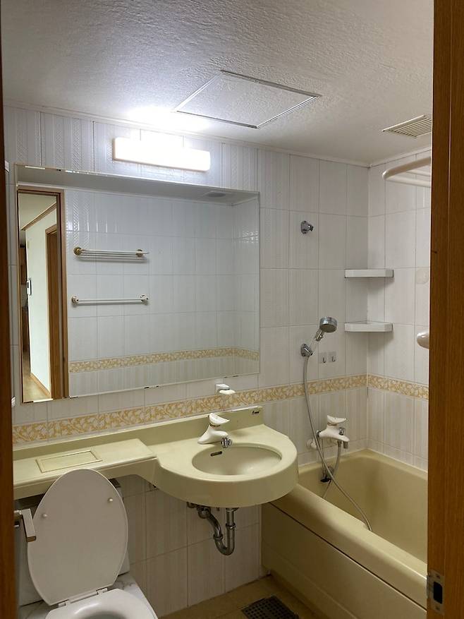 개인적으로 제일 보기 싫었던 화장실이에요. 노랗게 빛바랜 욕조와 세면대, 수전, 변기, 그리고 오래된 타일까지 솔직히 아주 잠깐이지만 '거실이나 방 같은 경우엔 도배나 바닥, 필름 정도만 교체하고 살아도 되겠다'싶었지만 화장실을 본 순간 올 리모델링이 시급하구나 싶은 생각이 든 공간이었어요.