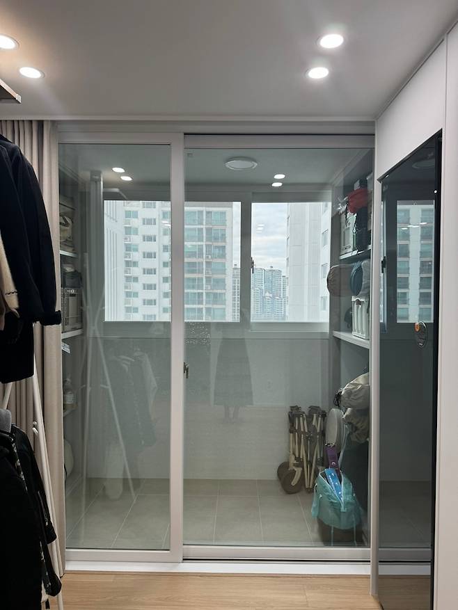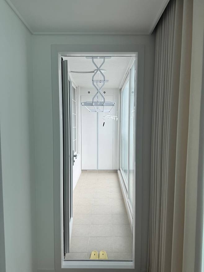 그리고 베란다 공간으로 나가는 쪽에 커튼을 달아 공간 분리를 해놓았어요. 다소 지저분한 짐들을 가릴 수 있고 또한 옷의 경우 햇빛을 받으면 색이 바랠 수 있다고 해서 커튼 시공은 잘한 선택이라고 생각해요.