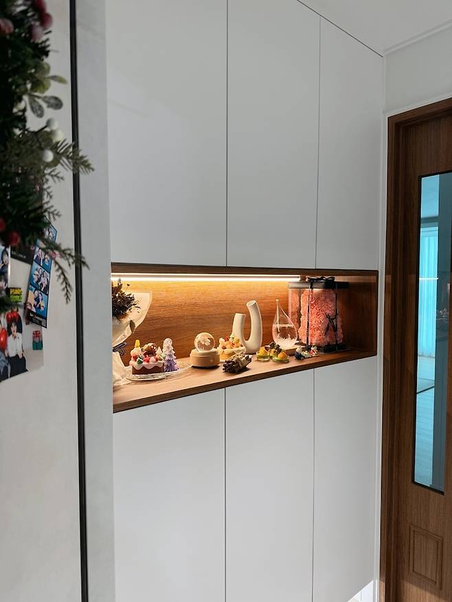 현관 신발장엔 꼭 오픈 우드장을 만들고 싶었어요. 남편과 함께 여행 갈 때마다 사 모은 피규어, 캔들과 소중한 추억이 있는 꽃다발을 장식해놓고 현관을 오고 가며 행복했던 추억에 빠지곤 하죠.