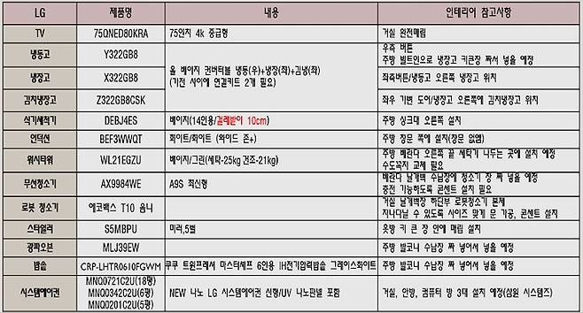 이렇게 인테리어 하기 전 각 공간마다 어떤 가전이 들어올지 결정한 다음 인테리어 업체에 정확히 말씀드려야 크기에 딱 맞는 장을 짜 넣을 수 있고(예를 들어 식세기의 경우는 식세기 크기에 맞춰 걸레받이 길이가 정해짐) 가전에 따라 인테리어가 결정되는 부분이 많다 보니 꼭 인테리어 전에 가전 졸업하시고 진행하시길 바라요.