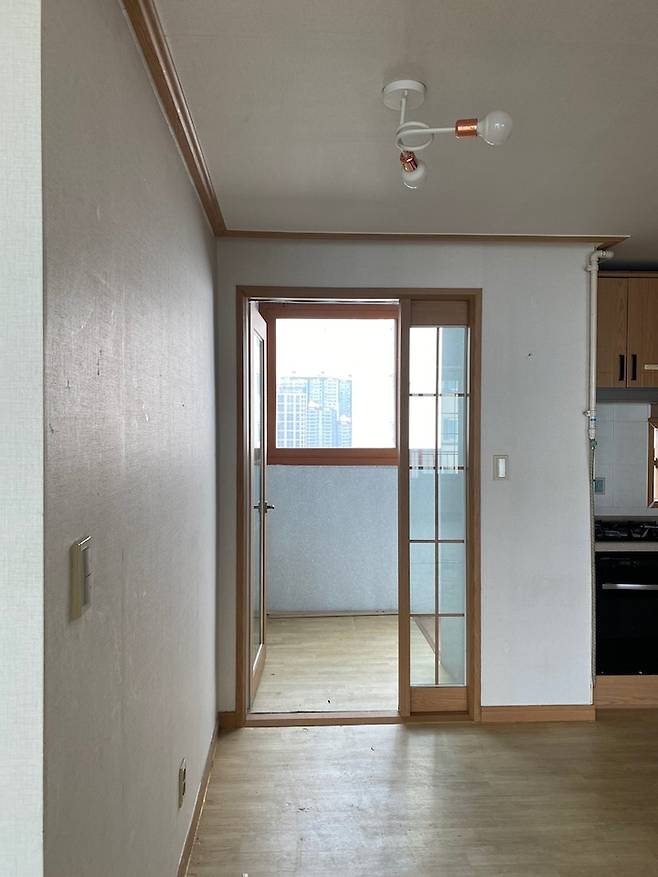 저흰 거실 공간을 좀 더 개방감 있고 넓게 쓰고 싶어서 거실 베란다 부분의 확장을 진행했어요. 그런데 구축 특성상 현실적인 제약에 빠지게 되었죠. 그건 바로 거실 날개벽 부분이 내력벽(옹벽)이다 보니 철거가 되지 않아 좀 더 드라마틱한 확장이 되지 못한 점이에요.