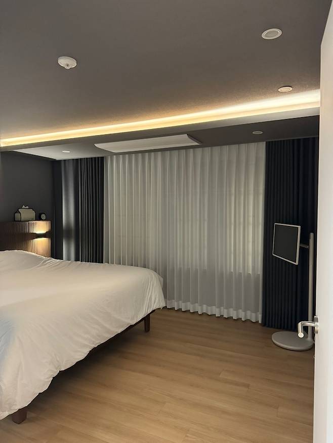 침실의 경우 처음부터 남편이 잠만 자는 공간으로 '침대만 놔두고 다른 거는 두지 말자'라고 말했던 부분도 있어서 호텔식 침대와 함께 스탠바이미 TV 정도만 두고 생활하고 있는 공간이에요.