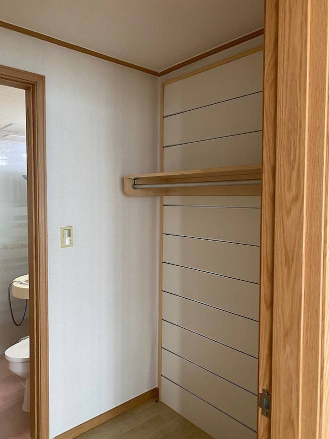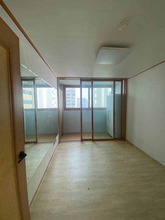 드레스 룸의 경우는 처음 저 무지막지한 큰 거울을 보고 여긴 분명 방인데 왜 댄스 연습실에나 있는 큰 거울이 있지 다 철거 진행하고 바깥 베란다 쪽 공간은 남편의 캠핑 짐을 놔두는 팬트리로 쓸 예정이라 확장 없이 타일 교체와 문 틀 필름 교체만 진행했답니다.