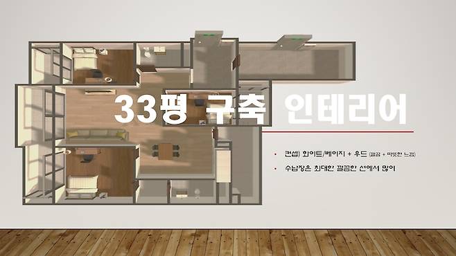 왜냐하면 집을 보기 전에 이미 구축 아파트를 사서 올 리모델링할 계획을 세웠었고 2bay 구조는 저희가 원하는 인테리어를 하기엔 어려운 구조라고 생각했기 때문이었어요. 그러던 와중 저희의 기준에 딱 맞는 정남향, 원하는 중간층, 판상형 3bay 구조의 33평 대단지 구축 아파트를 운명처럼 만나게 되었죠.