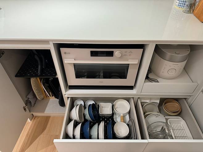 원래 계획은 오븐과 밥솥을 주방 발코니 장에 두려고 했으나 동선을 고려해 아일랜드 식탁 안쪽 공간에 두니 요리할 때 쉽게 쓸 수 있어 편하고 좋더라고요. 그리고 나머지 수납공간에는 자주 쓰는 그릇, 접시들을 두어 요리할 때마다 바로 꺼내 쓸 수 있게 배치해놨답니다. 이렇게 주방만큼은 동선에 맞는 효율적인 인테리어가 중요한 부분인 거 같아요.