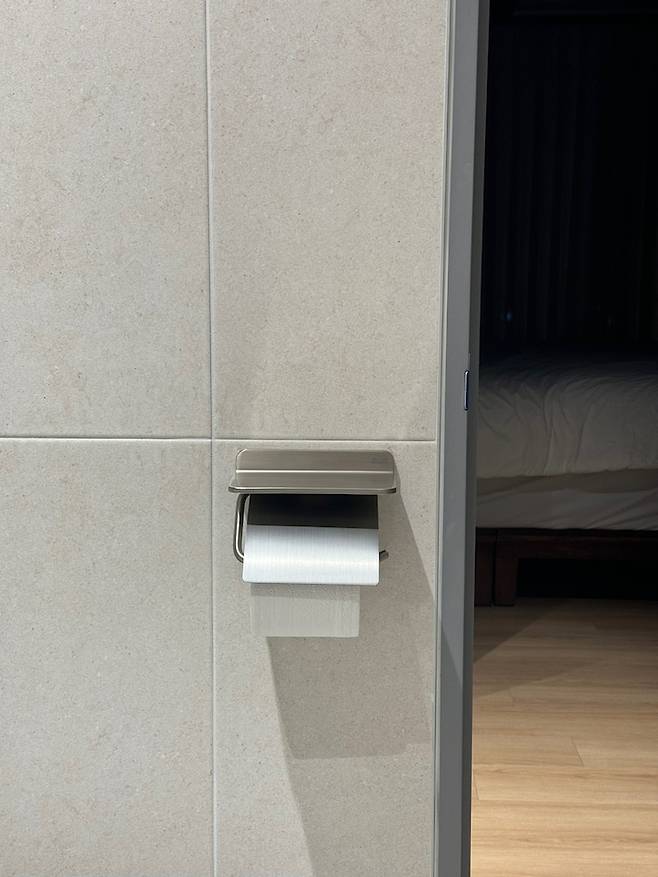 그리고 저나 남편이나 둘 다 화장실을 쓸 때 꼭 폰을 들고 가는 편이라 매립형 휴지걸이가 심미적으로 더 깔끔해 보이고 좋지만 저희에겐 꼭 폰을 올려두는 공간이 필요해서 매립형이 아닌 휴대폰 거치가 가능한 휴지걸이로 진행하였어요. 이렇게 저희의 라이프 스타일에 맞게 화장실 액세서리도 하나하나까지도 인테리어 업체 분들과 조율하며 진행하였답니다.