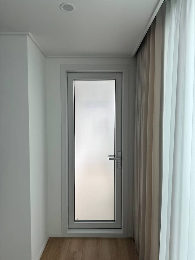 침실 베란다 나가는 쪽에는 외부 소음을 막아주고, 단열효과가 뛰어난 터닝 도어를 설치해 주었어요. 개인적으로 터닝 도어가 투박해 보여서 심미적으로는 보기 싫지만, 기능적인 측면에서는 워낙 장점이 많은 도어라 베란다 쪽에는 설치했답니다. 그래도 다행히 거실 확장부 쪽에 날개벽이 있어 거실에서는 터닝 도어가 안 보여서 그 부분은 좋아요.