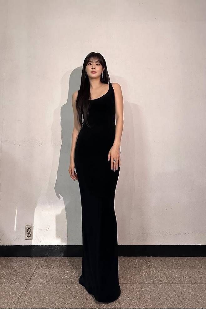 드레스는 보디라인을 따라 유려하게 떨어지는 실루엣으로 시크한 분위기를 극대화했고, 어깨를 드러낸 비대칭 컷이 포멀함 속에 감각적인 포인트를 더했습니다.
