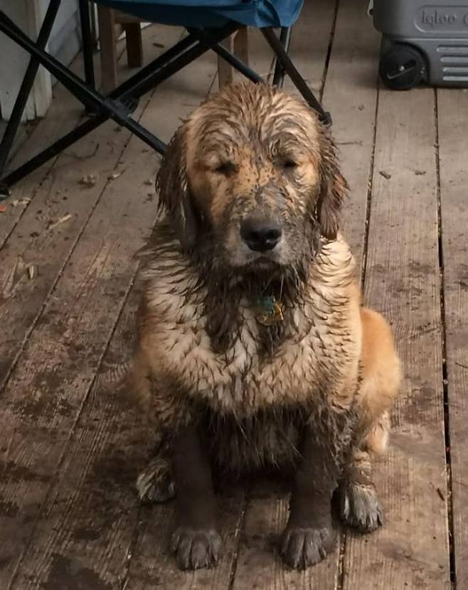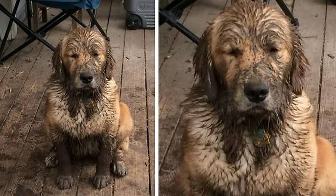 발끝부터 귀 끝까지 흙탕물로 완벽하게 코팅된 모습에,