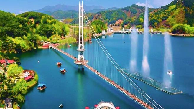 충청남도 예산군 응봉면 예당관광로 161에 위치한 ‘예당호 출렁다리’는 국내 최대 저수지 위를 가로지르는 402미터 길이의 대형 현수교다.