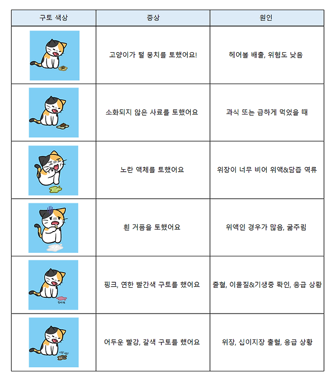 고양이가 헛구역질하다가 구토했다면, 그 토사물 색깔에 따라 구토 원인이 달라요. 특히, 토사물 색깔이 빨갛거나 검붉은 색이라면 출혈, 초록색이라면 췌장이나 위장관 질병에 의한 것으로 응급 상황입니다.