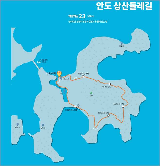 안도선착장 → 이 야포해변 → 오름쉼터 → 상산동 전망대 → 대나무숲길 → 백금포 삼거리 → 안도선착장