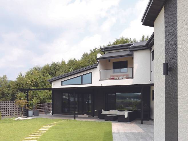 파란 하늘과 그러데이션을 그리는 산줄기는 보기만 해도 가슴이 시원해져 일품이다. 이를 오롯이 담고자 주택은 도로를 등진 ‘ㄱ’자 형태로 잡았고 자연스럽게 뷰와 주택 사이에 정원도 품게 됐다.