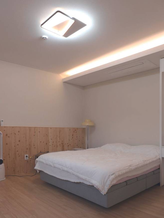 중심의 현관을 기준으로 공용공간 반대에 위치한 메인 침실은 드레스룸과 욕실을 묶어 마스터룸으로 계획했다. 공용공간과는 다르게 바닥재로 우드 톤 마루를 적용하고 간접조명을 포함한 천장을 더해 보다 아늑한 프라이빗 공간으로 조성했다.