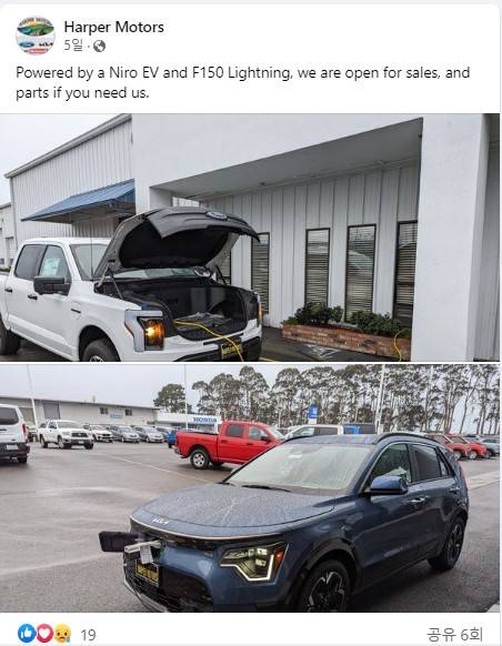 하지만, 캘리포니아에 위치한 자동차 수리센터 하퍼모터스는 정전이 발생한 후에도 정상 영업을 했다. 바로 전기차 V2L 기능을 활용해 자동차 수리에 필요한 전력을 공급한 것이었다. 기아 니로 EV와 포드 F150 라이트닝을 이용해 매장의 불을 밝혔다.