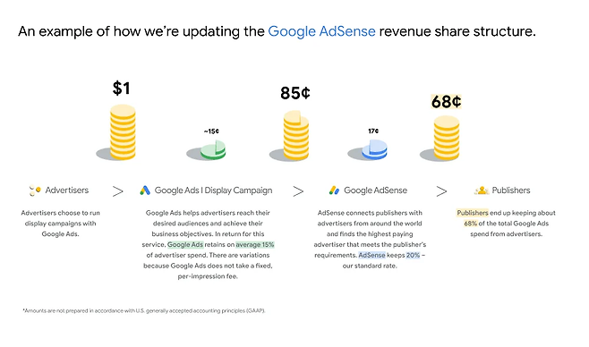 수많은 웹사이트와 블로그 운영자들은 자신이 보유하고 있는 매체에 애드센스를 추가하고 구글과 수익을 나누고 있습니다. 구글은 웹사이트 콘텐츠 및 방문자를 기준으로 관련성이 높은 광고를 게시하고, 광고주로부터 받은 광고비의 일부를 애드센스가 설치된 웹사이트 운영자에게 지급하는 것이죠. 지금까지 구글은 매체의 운영자에게 광고비의 약 32%를 수수료로 제하고 나머지 68%를 수익으로 제공해 왔습니다.