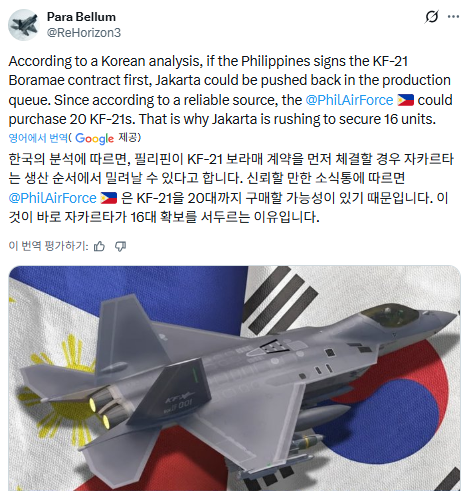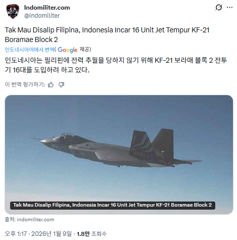 인도네시아 군사 전문 매체 인도밀리터리(Indomiliter)는 9일(현지 시각) 자카르타가 "생산 대기열에서 밀릴 수 있다"는 판단 아래 완제품 구매 계약을 우선 검토하고 있다고 전했습니다. 지금 동남아에서 벌어지고 있는 KF-21 보라매 쟁탈전을 한 문장으로 요약하면 이렇습니다.