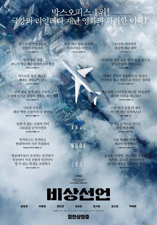 [마이데일리 = 양유진 기자] 이틀 연속 박스오피스 1위로 흥행 활주로를 활짝 연 '비상선언'이 리뷰 포스터를 공개했다.