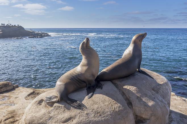 만약 물 속에서 바다사자를 직접 만나는 것이 두려우시다면, 해변가의 바위 위에서 일광욕을 즐기는 바다사자를 볼 수도 있습니다.
