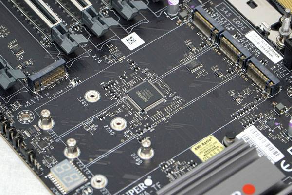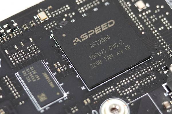 X13SWA-TF에는 일반 데스크탑 메인보드에서 볼 수 없는 ASPEED AST2600 BMC(Baseboard Management Controller) 및 4Gb DDR4 D램이 탑재된다. AST2600은 ASPEED의 7세대 서버 관리 프로세서이자 28nm 공정으로 만들어진 BMC Soc로 듀얼코어 Arm Cortex-A7 및 임베디드 Arm Cortex-M3 CPU를 채택하여 호스트 시스템의 원격 모니터링 및 유지 관리를 돕는다.