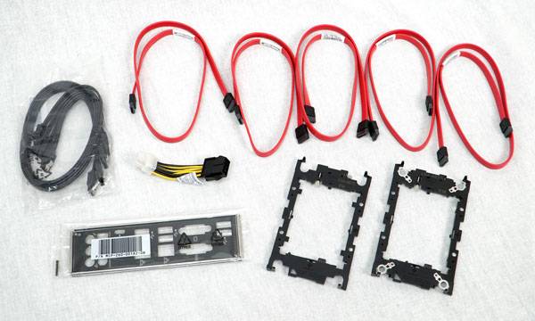 슈퍼마이크로 X13SWA-TF 구성물로는 메인보드와 간편 가이드를 비롯해 SATA 케이블 6개, I/O 쉴드, CPU용 소켓 E1A 및 E1B 프로세서 캐리어, 그리고 CPU-GPU 연결 전원 케이블 등이 들어간다.