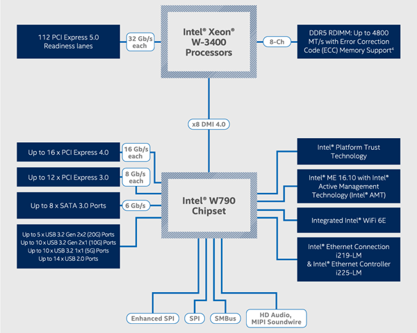 제온 W-3400에서는 8채널, W-2400에서는 4채널의 DDR5 RDIMM 메모리로 생산성을 높일 수 있고, 통합 인텔 Wi-Fi 6E 무선 및 2.5GbE 유선 네트워크 연결을 지원한다. 통합 USB 3.2 Gen 2x2 지원으로 최대 20Gb/s에 달하는 데이터 전송 성능을 제공한다.