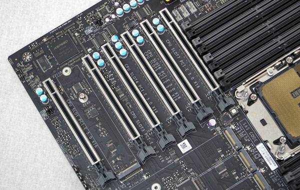 메모리 슬롯과 마찬가지로 PCIe (PCI Express) 확장 슬롯도 CPU에 직접 연결되기 때문에 어떤 제온 프로세서를 사용했느냐에 따라 쓸 수 있는 슬롯 구성이 달라지게 된다. 제온 W-3400 시리즈를 장착하면 6개의 슬롯 모두 PCIe 5.0 x16 인터페이스로 사용 가능하며, 제온 W-2400 시리즈를 장착했을 경우에는 CPU SLOT 1번, 4번, 6번으로 표시된 PCIe 슬롯은 동작하지 않으므로 절반인 3개의 슬롯만 쓸 수 있다.