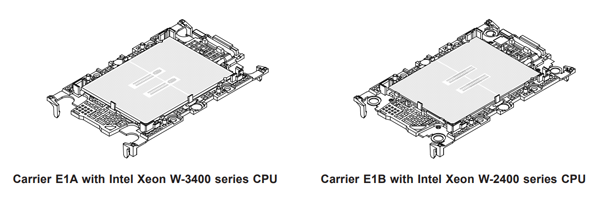 캐리어 및 CPU는 어떤 것을 사용해야 하는지 나타내는 캐리어 코드가 프로세서별로 지정되어 있는데, 제온 W-3400 시리즈(112L XCC)는 E1A, 제온 W-2400 시리즈(64L MCC)는 E1B 방식의 패키지 캐리어를 사용하므로 메인보드 구성물로 두 가지 프로세서 캐리어가 모두 제공된다.