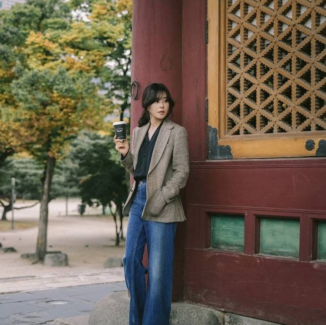 최강희는 클래식한 테일러드 재킷과 블라우스, 와이드 데님의 조합으로 세련되면서도 편안한 스타일을 완성했습니다.