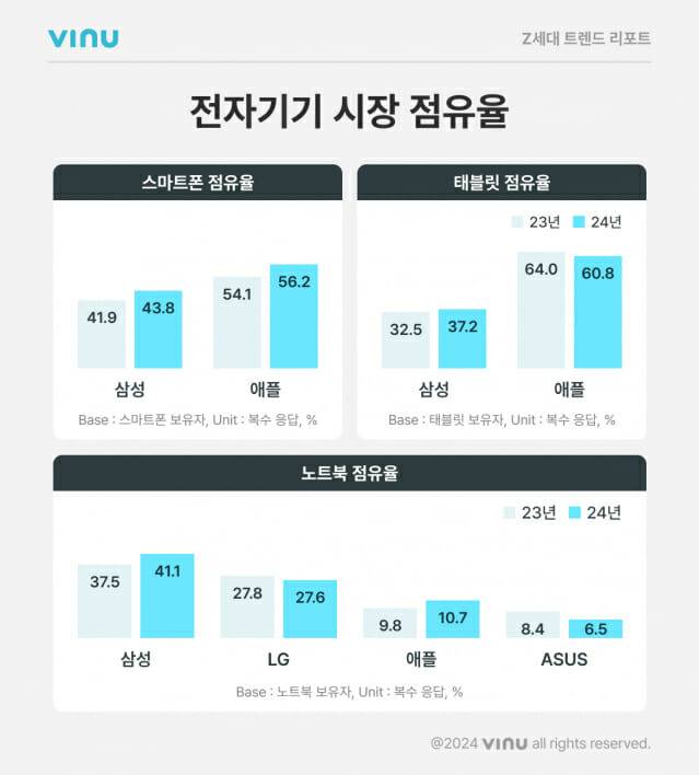 전자기기별 브랜드 점유율은 스마트폰과 태블릿은 애플이, 노트북은 삼성과 LG가 강세를 보였다. 먼저 스마트폰의 경우 애플이 56.2%, 삼성이 43.8%로 두 브랜드 모두 작년과 비슷한 양상을 보였다. 다만 태블릿의 경우 애플은 60.8%로 소폭 감소한 반면 삼성은 37.2%로 점유율이 늘어나며 격차를 좁혔다. 노트북은 삼성 41.1%, LG 27.6%로 양강 구도를 보였고 애플은 10.7%에 그쳤다.