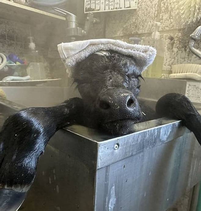 따뜻한 물에 몸을 담근 작은 송아지는 머리에는 작은 수건까지 얹은 채 두 눈을 가늘게 뜨고 있었는데요.