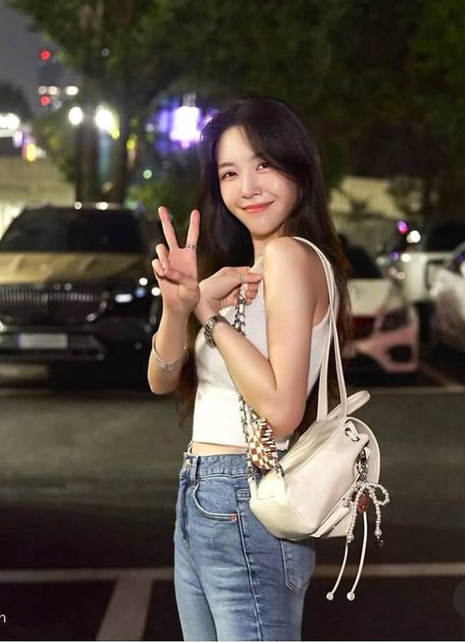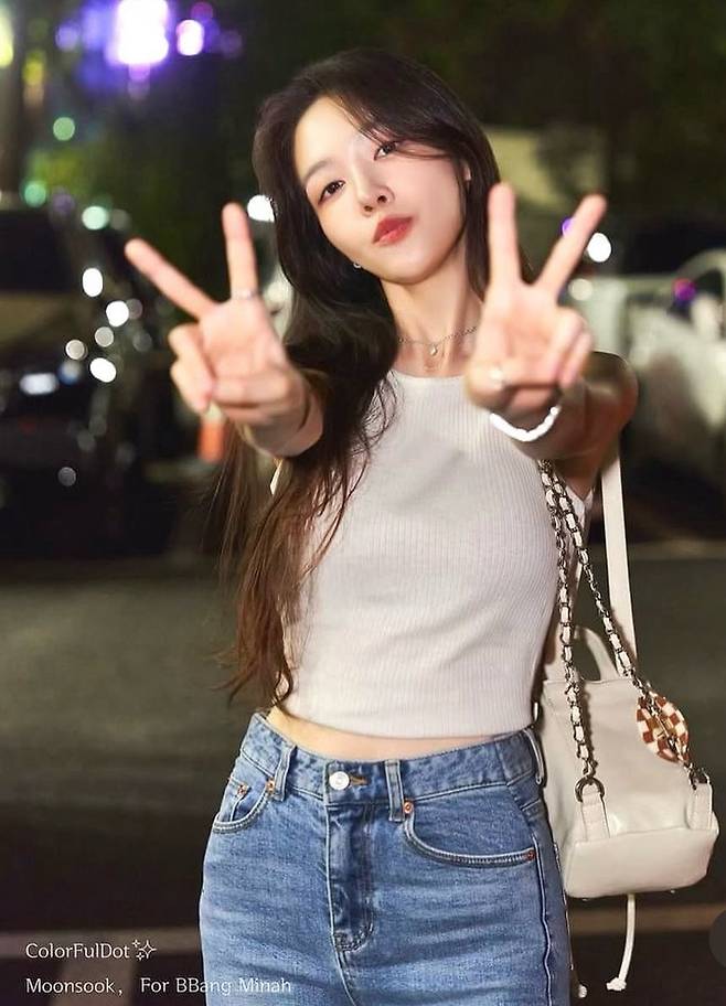 방민아는 화이트 슬리브리스 톱과 스트레이트 데님 팬츠를 매치해 깔끔하고 시원한 여름 스타일을 완성했습니다.