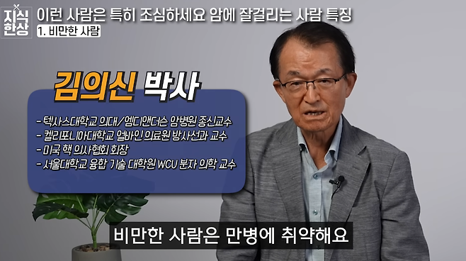 미국 핵의사 협회 회장이자 세계적인 암 치료 권위자인 김의신 박사는 유튜브 프로그램 ‘지식한상’에 출연해 건강식품과 식이요법에 대해 설명했다. 김 박사는 건강 유지를 위해 반드시 기억해야 할 것은 “혈관 관리”라고 강조했다. 나이가 들수록 혈관벽의 탄력성이 떨어지고, 콜레스테롤이 혈관에 들러붙어 각종 혈관 질환을 유발한다는 것이다. 이에 따라 혈관을 튼튼하게 유지하려면 음식을 통한 예방이 핵심이라고 말했다.